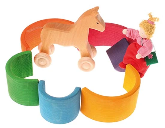 Ce large arc en ciel de construction est un jouet polyvalent qui offre de nombreuses possibilités de jeu. Les enfants peuvent empiler, trier les blocs par taille ou par couleur, construire, les utiliser comme support pour les jeux d’immitation (enclos pour animaux, berceaux pour poupée, tunnel, pont, maison etc …).