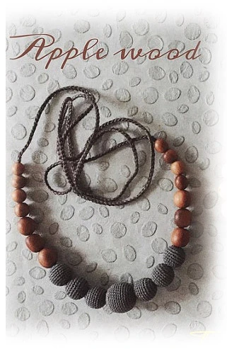 Le collier est composé de perles recouvertes en crochet et de perles de bois de Pommier.