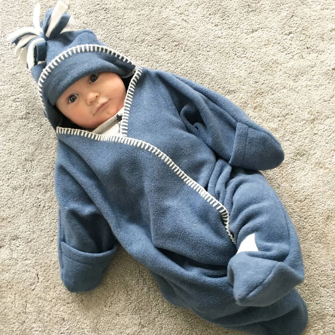Les petites mains de bébé sont conservées au chaud dans la couverture mais une ouverture est prévue pour pouvoir les sortir.