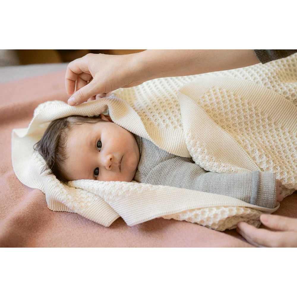 Optez pour une couverture 100% laine certifiée GOTS de la marque Disana, elle enveloppe bébé dans un doux et moelleux cocon.
