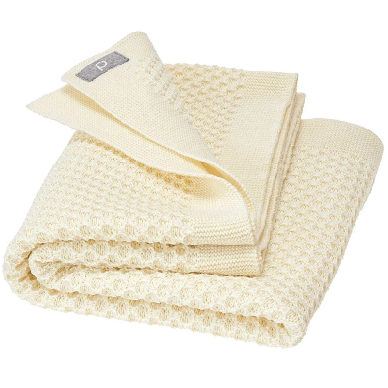 Une couverture nid d’abeilles tricotée en laine Mérinos certifiée GOTS à utiliser à la maison comme à l’extérieur !