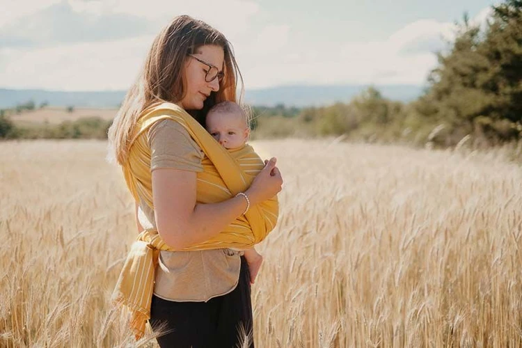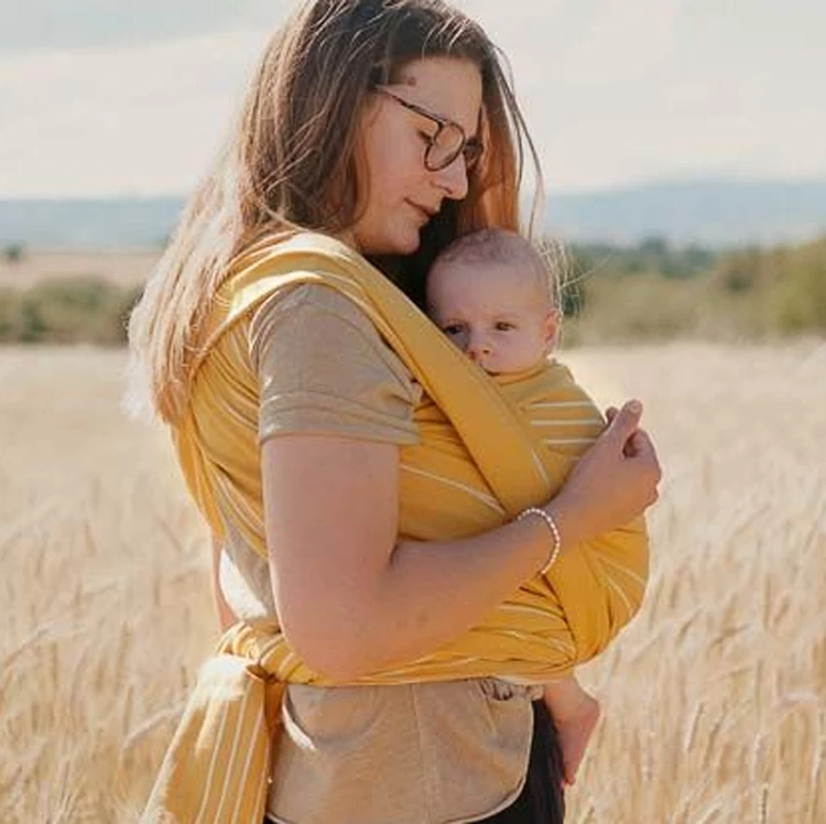 L’écharpe de portage TOURNESOL coton BIO de Néobulle va devenir indispensable dès la naissance de votre bébé jusqu’à ses 3 ans (environ 3.5 à 18kg).