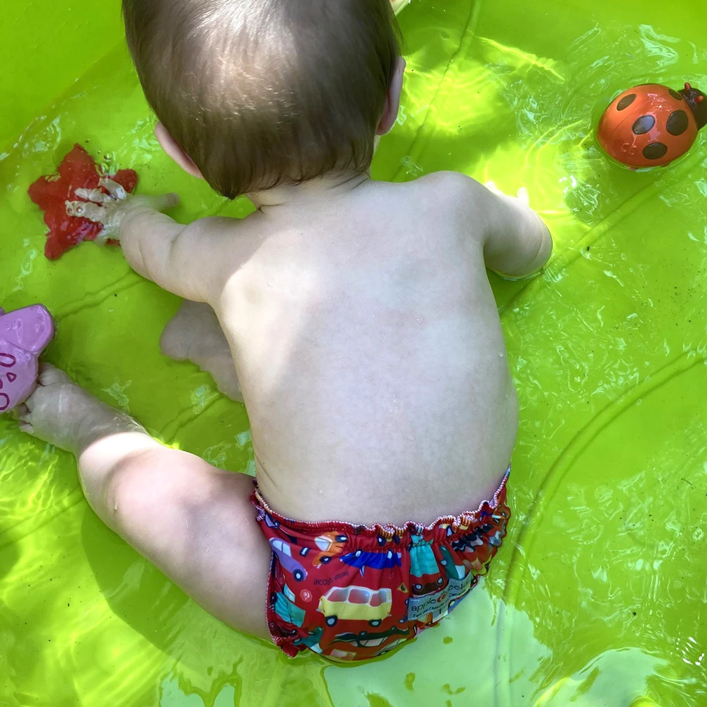 Contrairement aux maillots couches jetables, le maillot-couche I CAR lavable Applecheeks ne laisse pas passer les selles dans les piscines. Les selles restent DANS la couche et HORS de l’eau !
