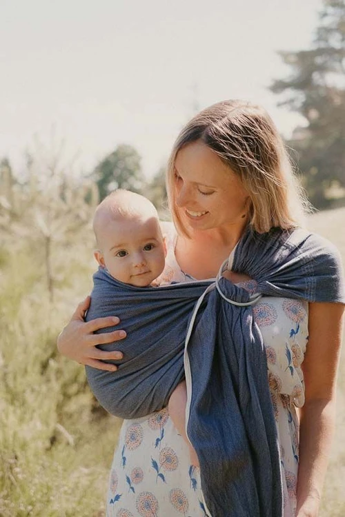 Très rapide à installer, il s’agit d’une écharpe sans noeud qui se glisse dans deux anneaux. Tissage en sergé croisé, comme le Bulline, mais la différence vient des plis qui sont ici non cousus. Ainsi, le Néo Sling se déploie totalement sur l’épaule du porteur et améliore son confort tout en gardant les mains libres !