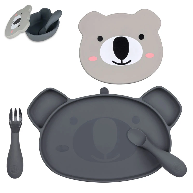 Assiette, bol/couvercle et cuillère en 100% Silicone alimentaire.