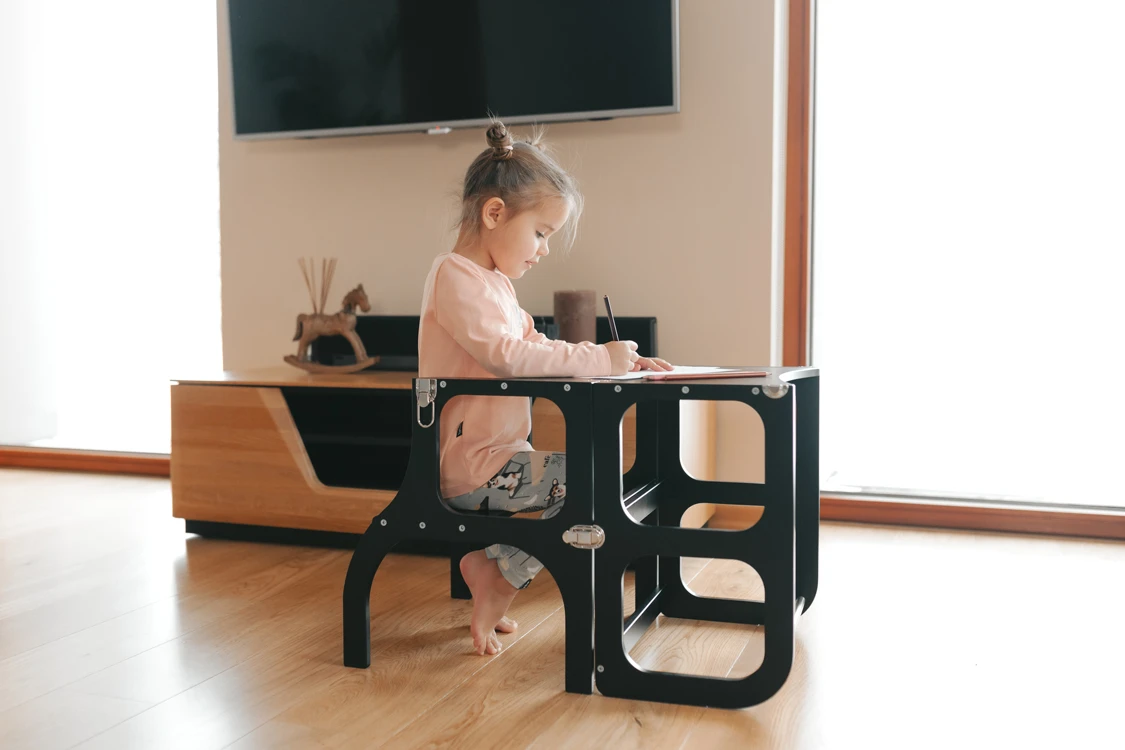 Descriptif du produit : Tour d’observation Montessori transformable Step’N’Sit – Black Silver